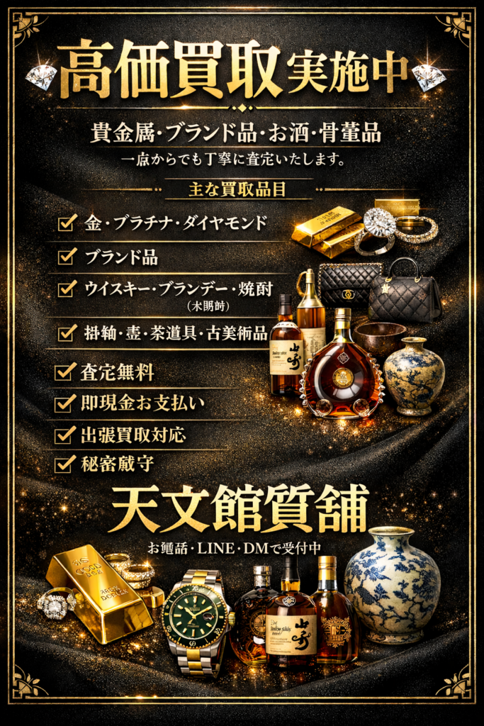 ・ 骨とう品 ・ 掛け軸 ・ 屏風 ・ 花瓶 ・アンティーク雑貨 ・ 焼酎 ・ 洋酒 ・ ウイスキー ・ 貴金属 ・ ダイヤモンド ・ 宝石 ・ 指輪 ・ ネックレス ・ 小判 ・ 古銭 ・ 金貨 ・ 銀貨 ・ ブランド品 ・ 腕時計 ・ 切手 ・ はがき ・ おもちゃ ・ 楽器 などなど 再販可能なものはお買取りさせて頂きます。