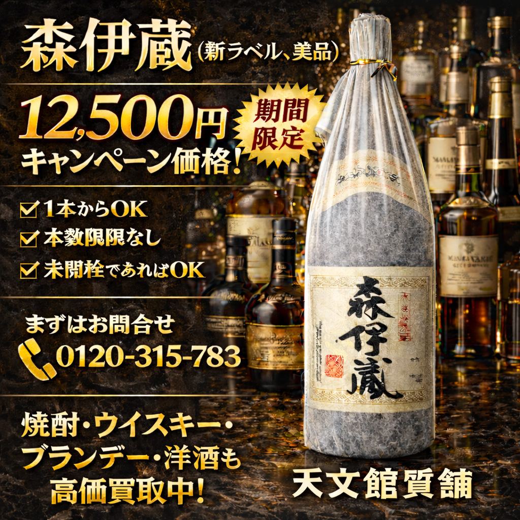 2026/02/25 こんにちは。 天文館質舗です。 当店では只今、森伊蔵の買取金額アップキャンペーン中です。 森伊蔵新ラベル美品を12500円でお買取させていただきます!! もちろん本数制限はございません。 この機会に是非ご利用ください。
